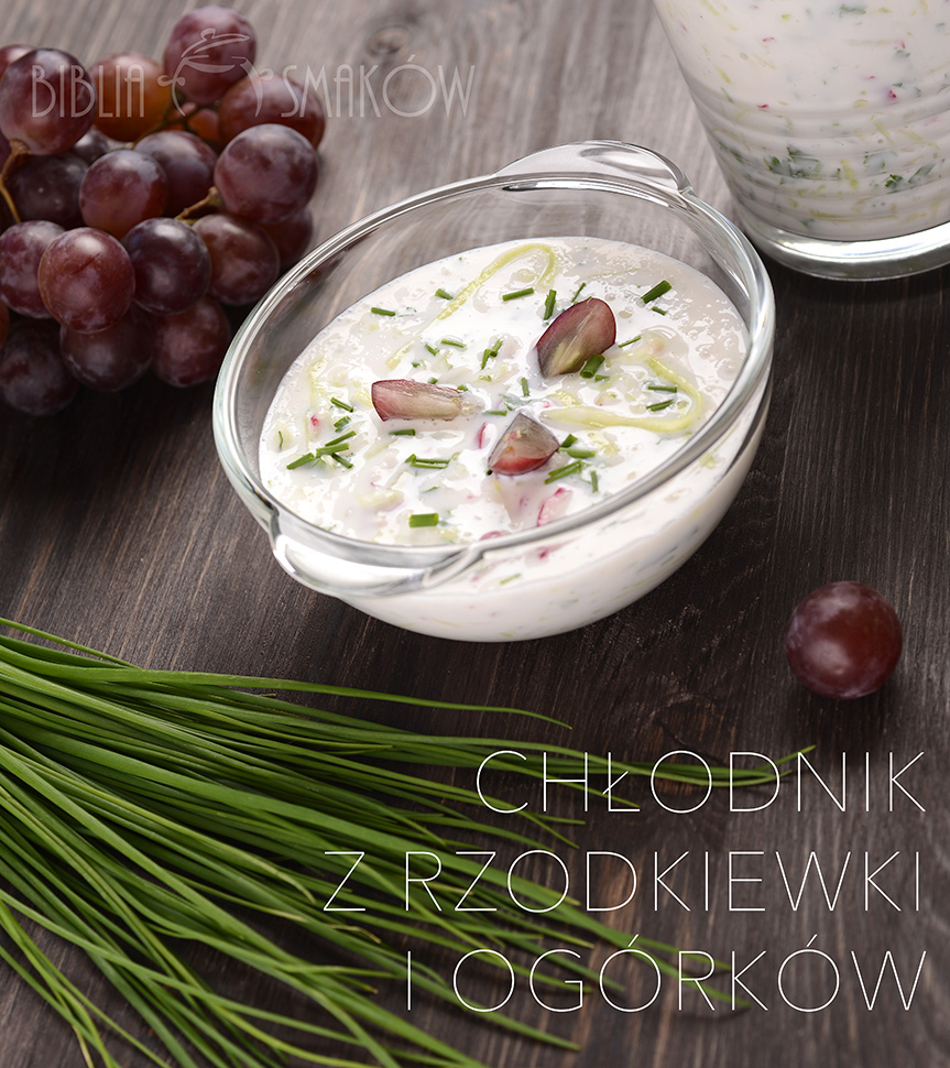 Ogórki obieramy i wraz z rzodkiewkami ścieramy na grubej tarce. Można odsączyć sok który wycieknie z poszatkowanych warzyw, ale my zostawiamy wszystko do chłodnika. Szczypiorek drobno siekamy – możemy zostawić trochę do dekoracji. Wszystko wrzucamy do miski i zalewamy maślanką. Przyprawiamy solą i pieprzem do smaku. Chłodnik wstawiamy do lodówki na minimum 2 godziny. Gotowy chłodnik rozlewamy do miseczek lub talerzy, dekorujemy połówkami winogron i podajemy.