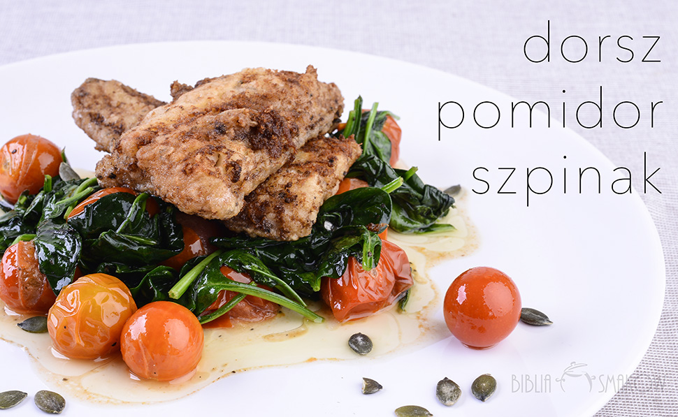 Na drugiej patelni roztapiamy odrobinę masła, wrzucamy pomidorki koktajlowe i posiekany czosnek. Smażymy przez chwile. Gdy pomidorki zaczną pękać dorzucamy szpinak, posypujemy solą i pieprzem. Mieszamy przez chwile, aż szpinak zmięknie. Wykładamy na talerz. Na szpinaku układamy rybę (możemy posypać pestkami dyni) i od razu podajemy.