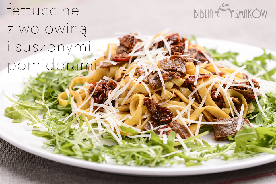 Uwielbiamy makarony. Za ich prostotę i czas przygotowania. Dziś szybko i smacznie z wołowiną, suszonymi pomidorami, znakomicie komponujący się z rukolą i parmezanem.