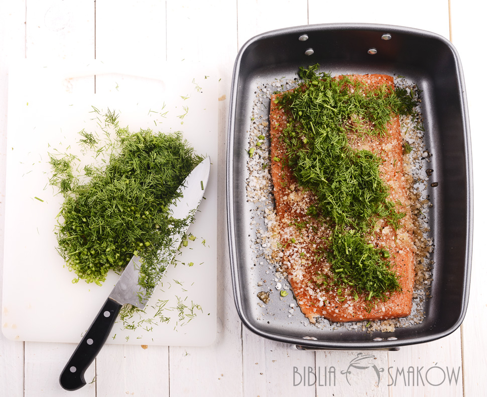 Płaty łososia sprawdzamy czy nie pozostały w nich jakieś resztki ości i jeśli tak to wyciągamy je pęsetą. Jeden z płatów układamy w naczyniu, drugi na desce do krojenia. Posypujemy pieprzem wewnętrzna stronę filetów. Sól, cukier i brandy mieszamy i obficie smarujemy oba filety łososia. Siekamy drobno koperek i posypujemy. Nie żałujemy koperku – ma on przykryć grubą warstwą całą powierzchnię ryby znajdującej się w naczyniu. Na wierzch kładziemy drugi filet – skórą do góry. Dostajemy „całego” łososia z przyprawami w środku.