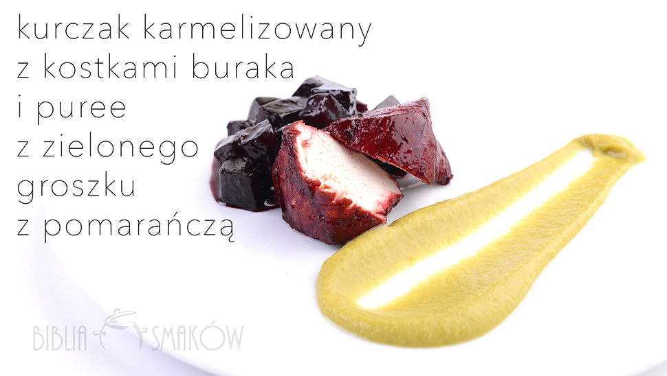 Dziś wariacja na temat buraków – jedna z wielu, bo to niezwykłe warzywo. Postanowiliśmy skameralizować kostki buraka, a przy okazji nadać filetom z kurczaka kolor, tak by po przekrojeniu kolor kontrastował z białym mięsem w środku. Uznaliśmy, że będzie do tego pasować puree z zielonego groszku, postanowiliśmy je jednak wzbogacić sokiem z pomarańczy