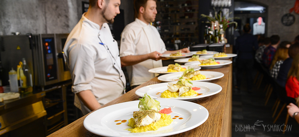 Jako kolejne danie podano nam filet z halibuta z ziołami, na risotto milanese, z sosem pomarańczowym i sałatką z ogórka, fenkułu i grejpfruta. Po raz kolejny trzeba przyznać, że to miejsce gdzie rządzą ryby i owoce morza. Halibut delikatny, świetnie zbalansowany z przyprawami, risotto doskonałe. Sałatka aromatyczna i orzeźwiająca. Świetne danie na wiosenno-letnią kolację. Podobnie jak przystawki, halibut podany był z Gavio di Gavi – białym winem ze szczepu cortese produkowanym w Piemoncie. Delikatne nuty brzoskwiniowe, cytrusy, duża mineralność wina była świetnym uzupełnieniem dań.
