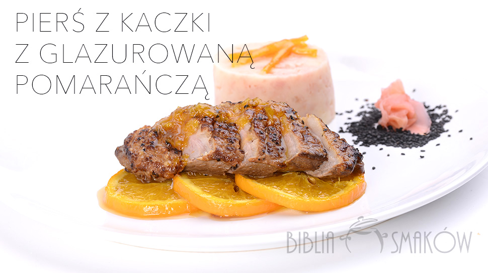 Pomarańcze dokładnie myjemy i sparzamy wrzątkiem. Jedną pomarańcze kroimy w plastry. Z drugiej wycinamy miąższ a z reszty wyciskamy sok. W razie potrzeby wyciskamy sok z kolejnej pomarańczy – potrzebujemy ok 100ml. Na patelnie z odrobiną masła wlewamy sok z pomarańczy i miąższ. Dokładamy łyżkę miodu i mieszając redukujemy sos. Gdy zacznie gęstnieć wkładamy plastry pomarańczy, glazurując je przez 1-2min po obu stronach. Plastry wykładamy na talerz. Wlewamy do sosu sok spod filetów. Mieszamy. Kaczkę kroimy w plastry układamy na plastrach pomarańczy, polewamy sosem i podajemy.