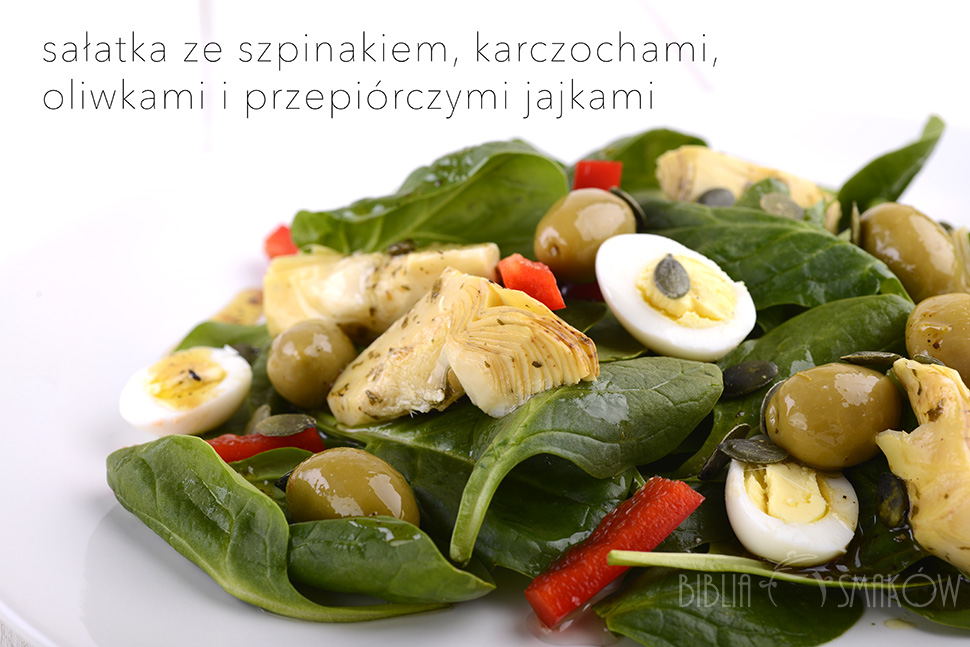 Jajka gotujemy i obieramy ze skorupek. Szpinak myjemy osuszamy i kładziemy na talerz. Paprykę kroimy w paski i kładziemy na szpinaku. Na to wrzucamy oliwki, przekrojone na pół jajka, karczochy. Oliwę, sos sojowy i limonkę mieszamy razem i sosem polewamy sałatkę. Podajemy od razu.