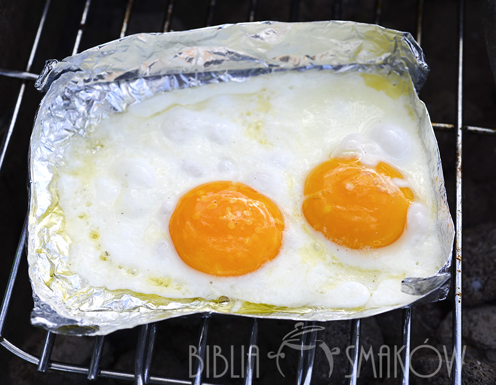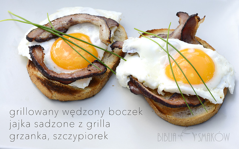 Jeśli macie patelnię, którą można postawić na grillu to ją wykorzystajcie. My nie mieliśmy – wiec uformowaliśmy „miseczkę” z folii aluminiowej. Roztopiliśmy na niej odrobinę masła i wbiliśmy jajka. Chleb posmarowaliśmy cienko masłem i położyliśmy na grillu. Plastry boczku położyliśmy na najbardziej rozgrzanej części grilla, by się mocno podpiekły z obu stron. Wszystko było gotowe mniej więcej w tym samym momencie. Ułożyliśmy na talerzu grzankę z chleba, na niej boczek i jajko. Udekorowaliśmy świeżo zerwanym szczypiorkiem. Było znakomite. Polecamy!