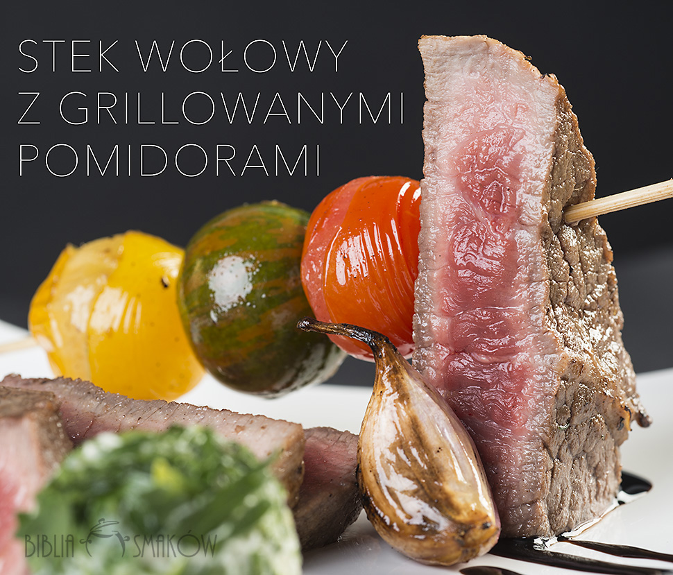 Pomidory koktajlowe nadziewamy na wykałaczki od szaszłyków. Rozgrzewamy patelnię grillową. Kładziemy na patelni steki i czekamy. Obok steków możemy położyć ząbki czosnku w łupinach. Dadzą nam aromat a nie przypalą się, w środku natomiast będą miękkie. Steki smażymy po 2min z każdej strony by uzyskać krwiste, po 4-5 by uzyskać średnio wysmażone i ok 7-8 by były wysmażone. Steki przewracamy tylko raz!. Stopień dopieczenia steka sprawdzamy naciskając go lekko – im bardziej sie ugina tym bardziej jest krwisty. Usmażone steki zdejmujemy z patelni i odkładamy na talerz by odpoczęły. Na patelni układamy szaszłyki z pomidorów i chwile grillujemy z obu stron. Warto uprzednio pomidory lekko nakłuć, wtedy mniej będą pękały.