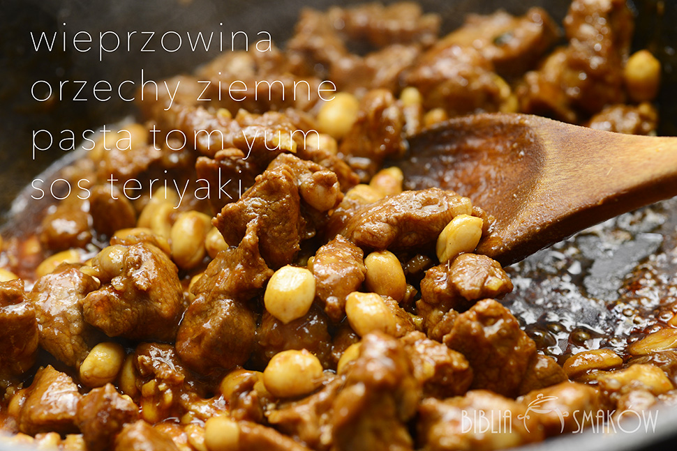 Na rozgrzany tłuszcz wrzucamy pokrojoną w kostkę wieprzowinę. Mieszamy. Po chwili dodajemy posiekaną papryczkę chili, pastę tom yum i 50-100ml wody. Po 3-4 minutach dorzucamy orzechy. Dusimy jeszcze przez chwile, aż orzechy lekko zmiękną. Na sam koniec polewamy sosem teriyaki i sokiem z limonki. Mieszamy. Podajemy z ryżem. Smacznego 🙂