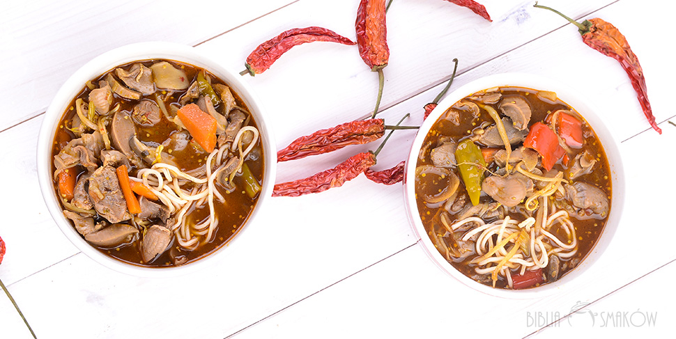 Jako podstawę zakupiliśmy kilogram żołądków. Szukaliśmy gęsich, niestety skończyło się na kurczaku. Żołądki umyliśmy i wrzuciliśmy na woka, na którym roztopiliśmy 2 łyżki tłuszczu z pieczenia boczku bbq i przyprawiliśmy sosem sojowym. Po kilku minutach smażenia przerzuciliśmy mięso do wolnowaru. Wolnowar ustawiliśmy w opcji „low”, by nasza potrawa przygotowywała się powoli. Dolaliśmy litr bulionu wołowego. Dorzuciliśmy pokrojony w plasterki dość duży kawałek imbiru oraz słoiczek pikli z zielonego chili i torebkę pasty, po której spróbowaniu wykręciło nas od kwaśnego tamaryndowca i sosu ostrygowego. Dodaliśmy łyżeczkę mielonych papryczek bird eye oraz poszatkowane boczniaki. Po około 40 minutach spróbowaliśmy sosu…ostry… ale jak szaleć to szaleć.. łyżka pikli limonkowych – kwaśno, słodko, słone z delikatnym aromatem anyżu i cynamonu, łyżka pasty z czerwonego chili, żeby zielonemu nie było smutno, łyżka pasty z czosnku i chili. Dodaliśmy warzywa – marchew i czerwoną paprykę. I wzmocniliśmy całość kilkoma łyżkami sosu bbq, w którym piekliśmy boczek. Zostawiliśmy wolnowar na 3h. Po tym czasie dorzuciliśmy swieże kiełki fasoli mung i zostawiliśmy na jeszcze godzinę. W efekcie dostaliśmy wybuchową mieszankę, o konsystencji gęstej zupy, cudownie ostrą i będącą prawdziwą eksplozją smaków. Danie na pewno nie dla tych, którzy lubią jak im się aromaty nie mieszają 😀