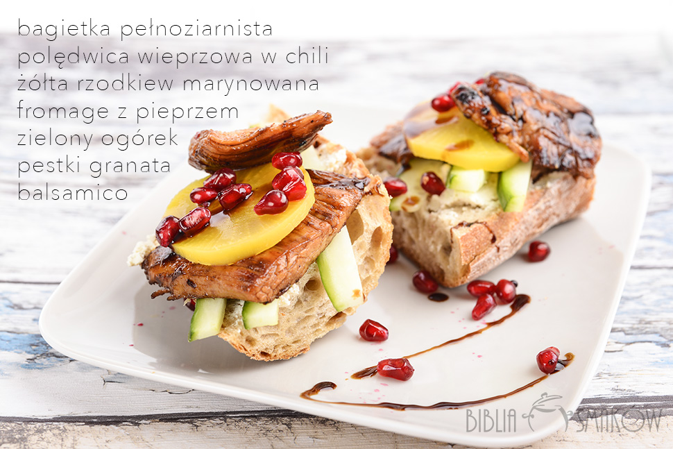 Bagietkę kroimy w kawałki i każdy przekrawamy na pół. Plastry polędwiczki zamarynowane w czosnku, chili, oliwie i limonce wrzucamy na patelnie. Smażymy po 2 minuty z każdej strony. Wykładamy na talerz by odpoczęły. Bagietkę smarujemy serkiem fromage, na to kładziemy paski zielonego ogórka. Następnie układamy polędwiczki i plastry rzodkwi. Posypujemy pestkami granata i dekorujemy kilkoma kroplami balsamico. Smacznego