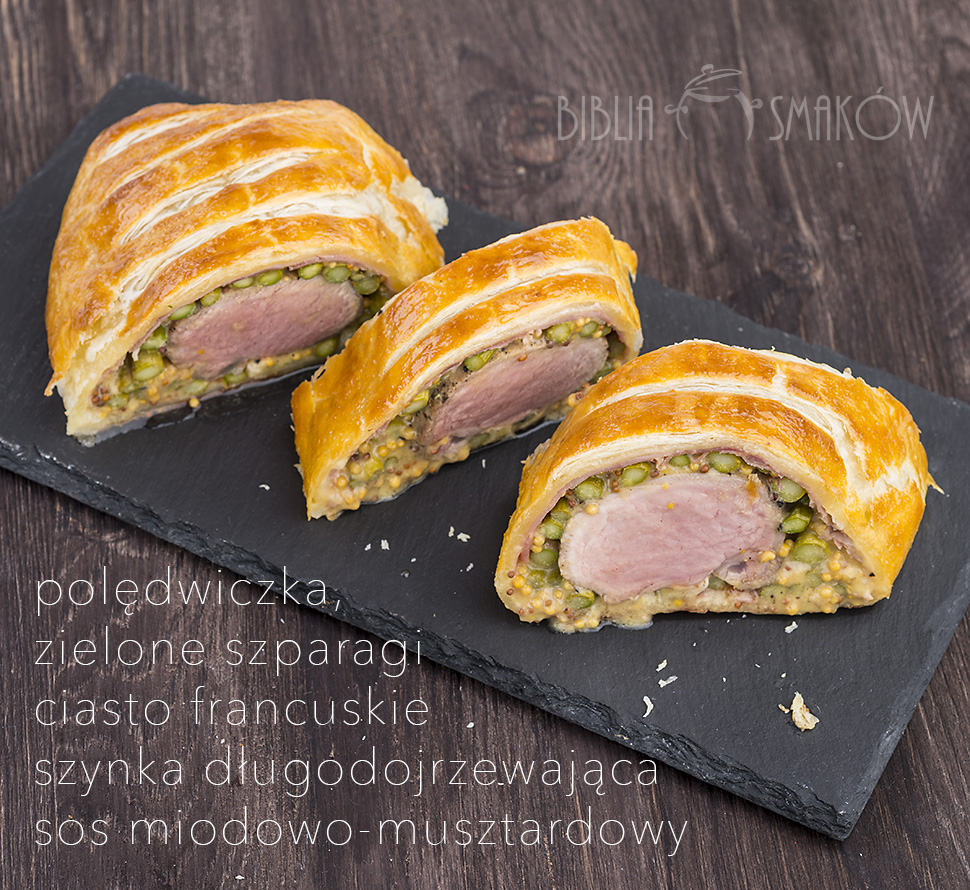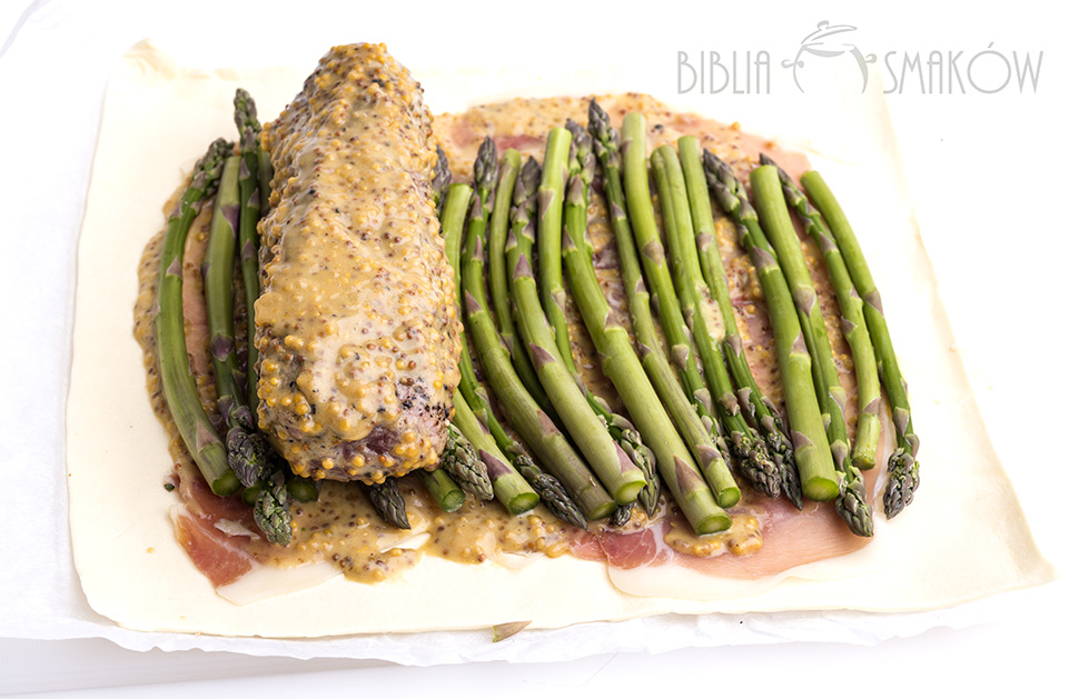 Mieszamy obie musztardy z miodem i limonką. Polędwiczkę dzielimy na 2 części – na szerokość ciasta francuskiego. Solimy, pieprzymy. Na patelni roztapiamy masło i obsmażamy mocno mięso ze wszystkich stron. Odkładamy polędwiczkę na talerz i od razu smarujemy 1/3 sosu musztardowego. Chodzi o to by ciepłe mięso wchłonęło aromaty sosu. Rozwijamy ciasto francuskie, dzielimy na dwie części (takie by dało się zawinąć wraz z mięsem). Układamy plastry szynki, pozostawiając wolne brzegi do zaklejenia. Smarujemy resztą sosu musztardowego. Układamy szparagi przycięte do szerokości ciasta. My wybieramy cienkie zielone. Jeśli macie do dyspozycji grube lub białe to polecamy przeciąć je wzdłuż. Na szparagach układamy mięso. Zawijamy całość zaklejając bok i oba końce. Smarujemy roztrzepanym żółtkiem. Wkładamy do piekarnika rozgrzanego do 180stopni na około pół godziny (czas podany na opakowaniu ciasta). Po upieczeniu wyciągamy i zostawiamy by odpoczęło około 10 minut.